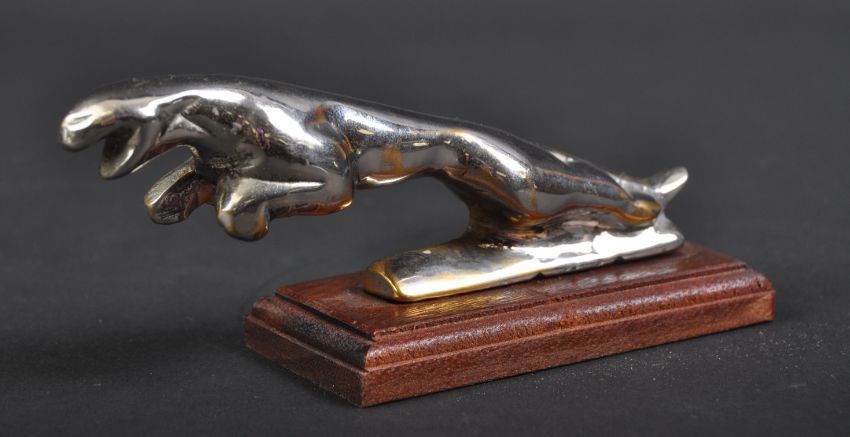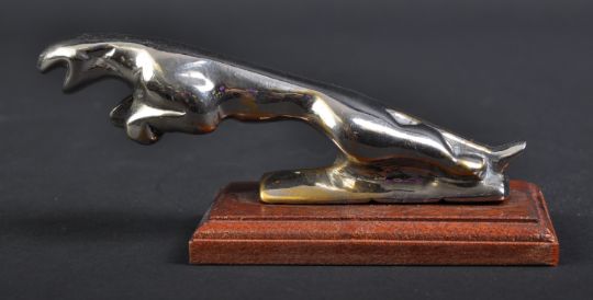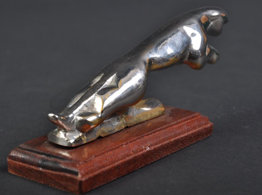 Jaguar Mascot - a vintage 20th century Jaguar type Leaper car bonnet mascot. Unusual brass construction, lacking detail in comparison to others of the period. Mounted on a wooden display base. Nose to tail 12cm. (396)