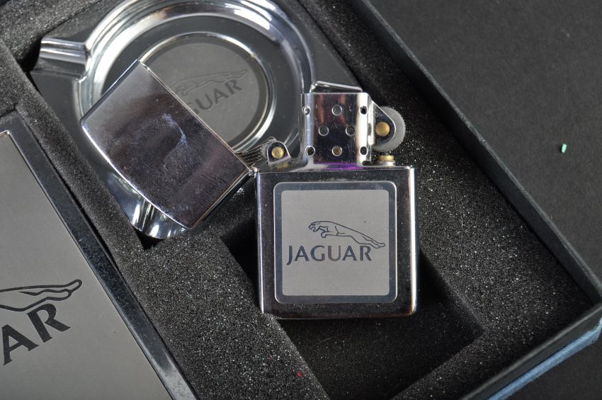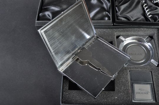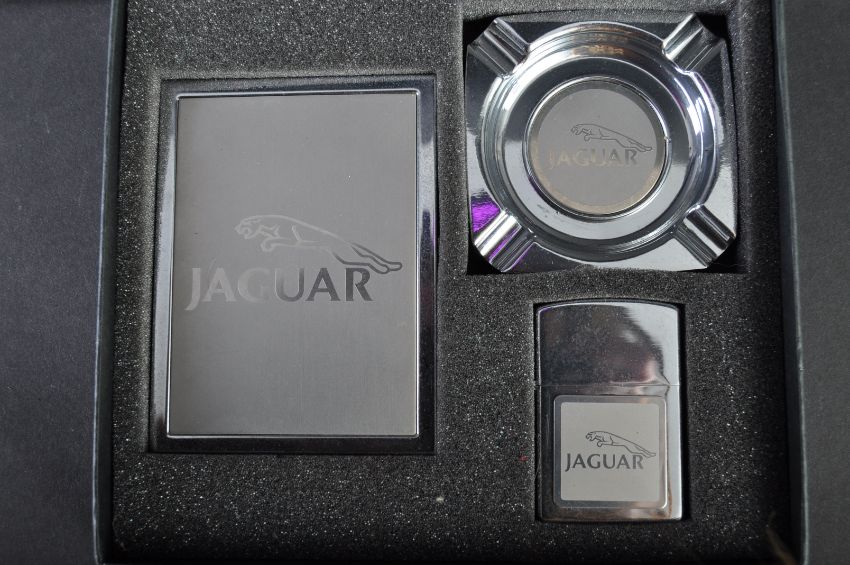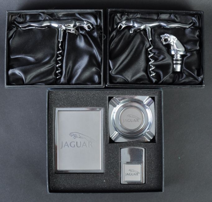Jaguar - a collection of x3 Jaguar branded special giveaway items (likely sold with brand new cars), to include; a boxed corkscrew with leaper mascot, a cased smoking set comprising lighter and ashtray, and another cased corkscrew set with leaper headed cork / stopper. All within their original presentation boxes. (225 8 48)