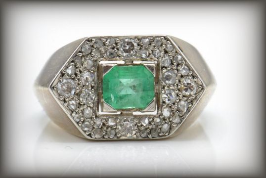 A retro 50's emerald and diamond ring. The ring set with a central emerald surrounded by pave set diamonds in rose and brilliant cuts. Unmarked.  Weight 9.6g. Size M.5 - O.