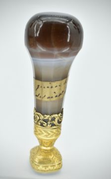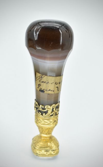 A cased 19th century banded agate desk seal. The desk seal having a banded agate balustrade handle with yellow metal pierced scrolled and chased mounts having blank white seal - likely chalcedony. The desk seal having a fitted case and attached old label with fountain pen notation.  Unmarked - yellow metal tests indicate18ct gold in parts. Weight 64.0g. Measures approx 8cms length.