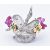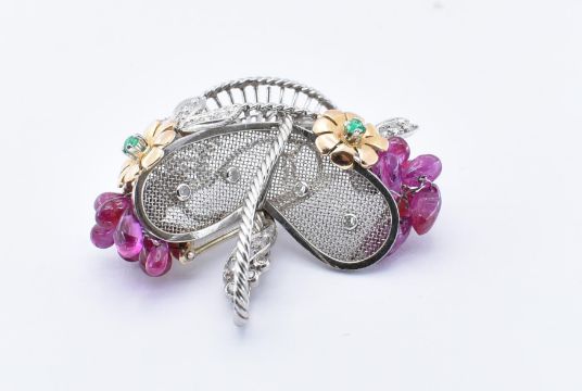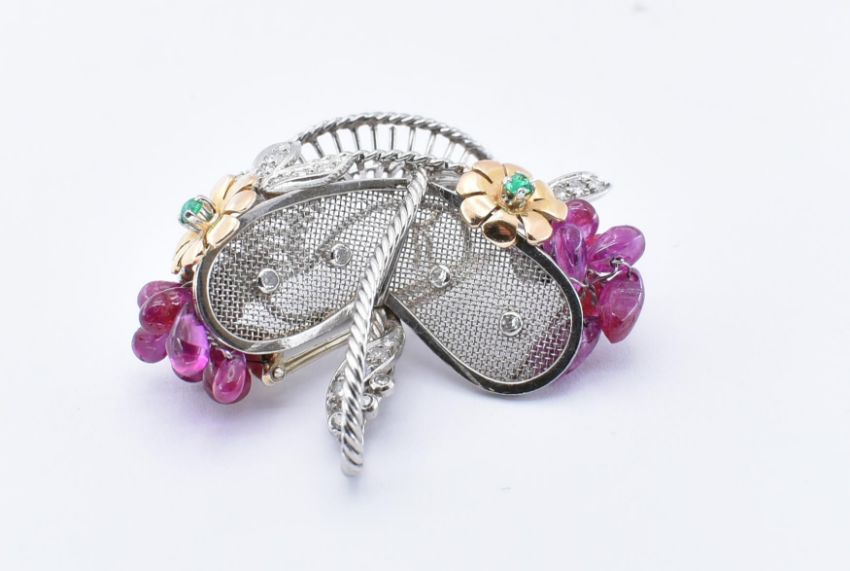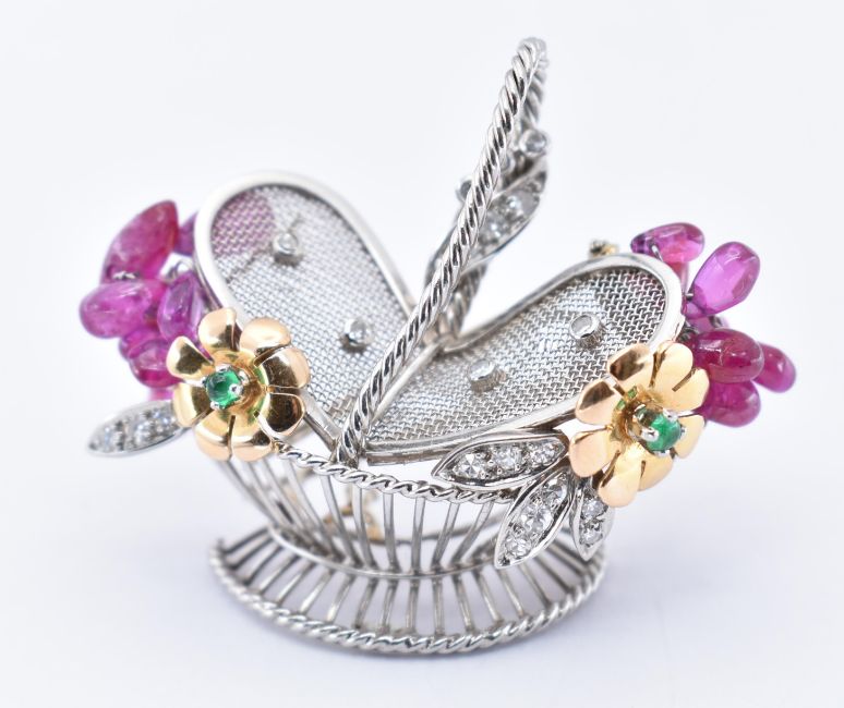 A French18ct white gold  ruby and diamond novelty brooch clip. The clip in the form of a basket having ruby bead embellishments and set with round brilliant cut diamonds and cabochon emerald within floral motifs having twin clip fastener verso. The body having French punch marks for platinum and 18ct gold, the pin having marks for gold. Weight 12.3g.  Measures approx 4cms.