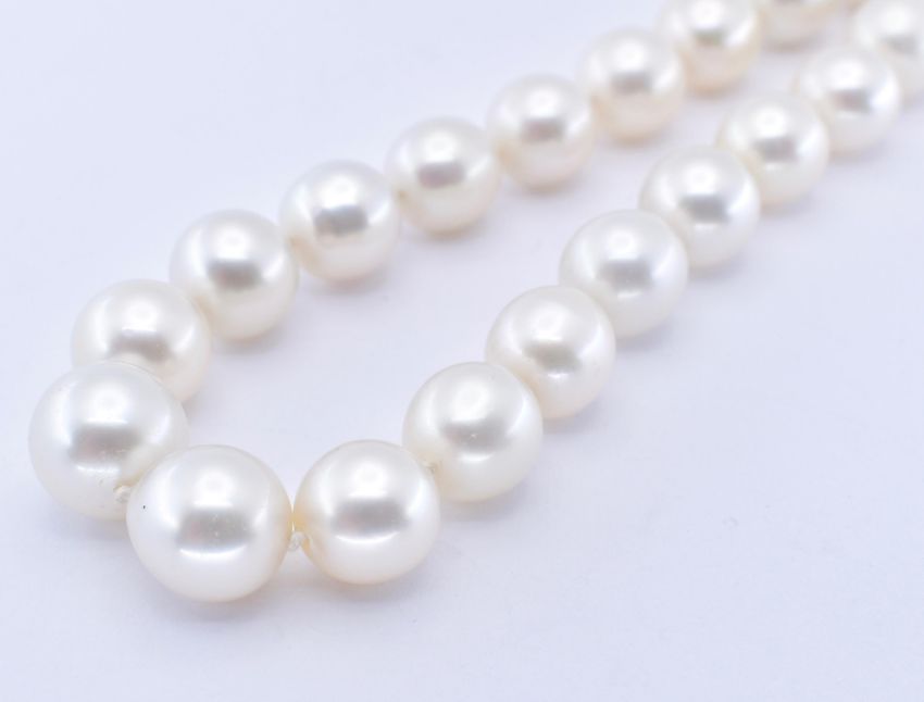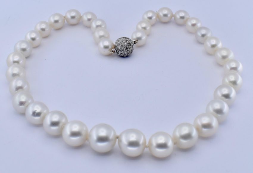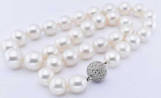 An hallmarked 18ct white gold diamond and pearl collar necklace. The necklace strung with 34 pearls united by diamond set screw ball clasp. Hallmarked London Sponsor MGD. Weight 68g. Measures 44cm. Pearls 10mm - 12.5mm.