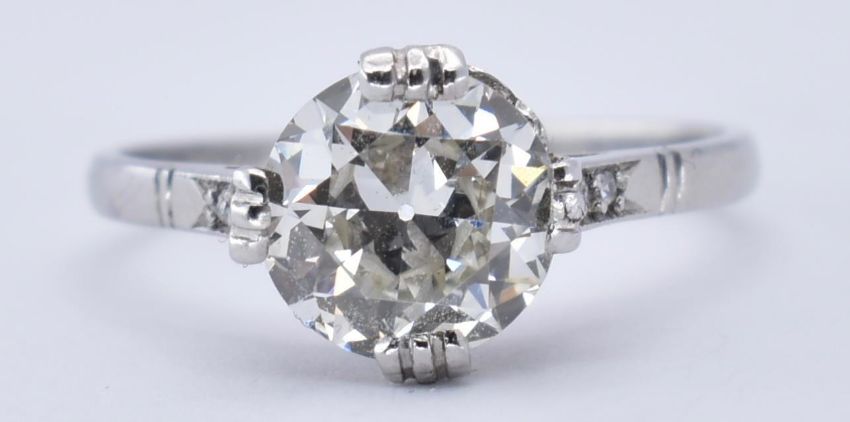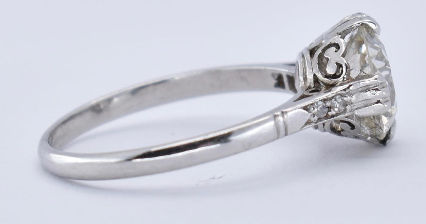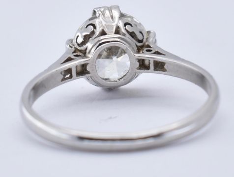 A platinum and diamond solitaire ring. The ring set with  a large old cut diamond being 7.4mm x 7.4mm x 3.9m, estimated diamond weight 1.5ct. Set to plain tapering shank with chased shoulders. Total weight 2.65g / Size K