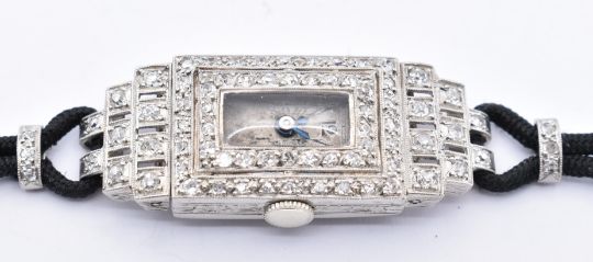 An Art Deco platinum and diamond cocktail watch. The watch strung on a black silk cord having snap clasp. The tank faced watch encrusted with diamonds having rectangular sapphire crystal with arabic numers to the chapter ring with stud dagger hands. Total weight 15.4g /  16cm length