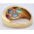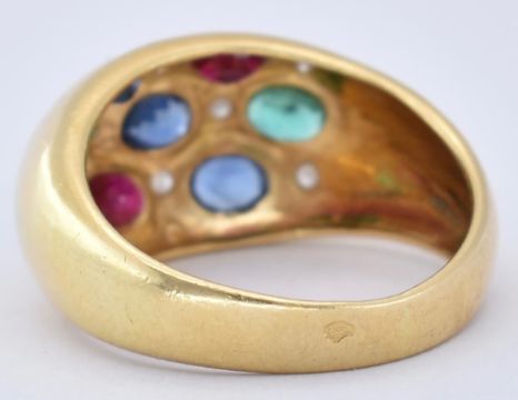 A French 18ct gold ruby emerald and sapphire dome ring. The ring set with mixed cut precious coloured stones to dome head to plain tapering shank. French eagle punch mark. Total weight 5.10g / Size M.5