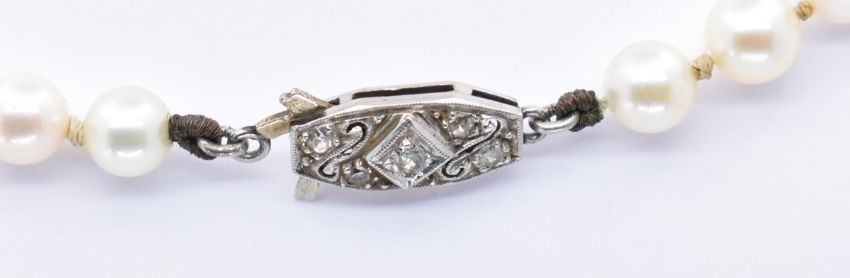 A gold and diamond Akoya pearl necklace. The necklace formed of a string of knotted Akoya pearls united by a diamond set platinum clasp. The clasp set with five single cut diamonds with pierced scroll and millegrain decoration.  Unmarked, clasp tests as platinum hook tests as gold.  Weight 14g.  Measures 38.5cms.  Pearls approx. 5.2mm – 5.4mm - round.