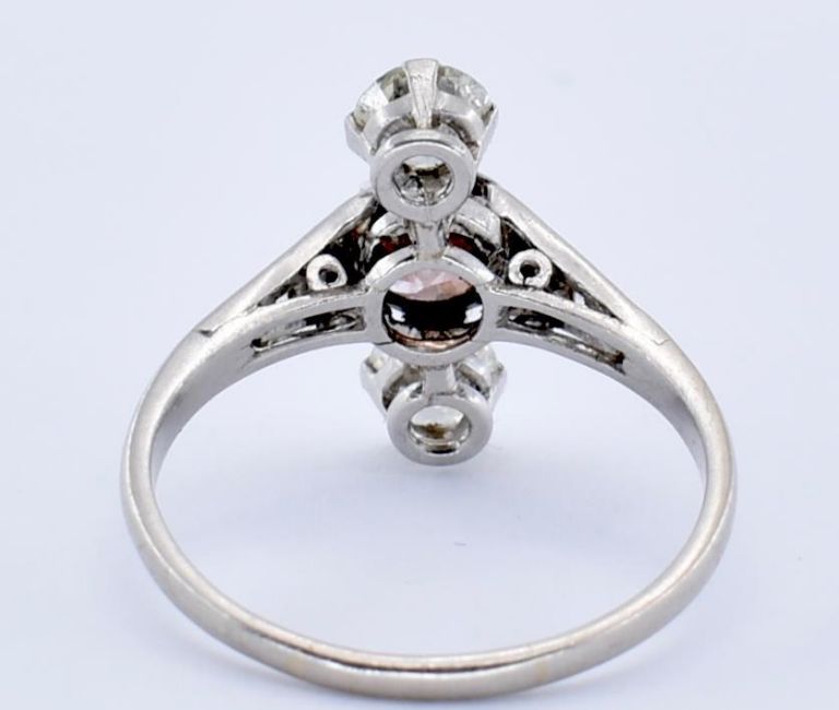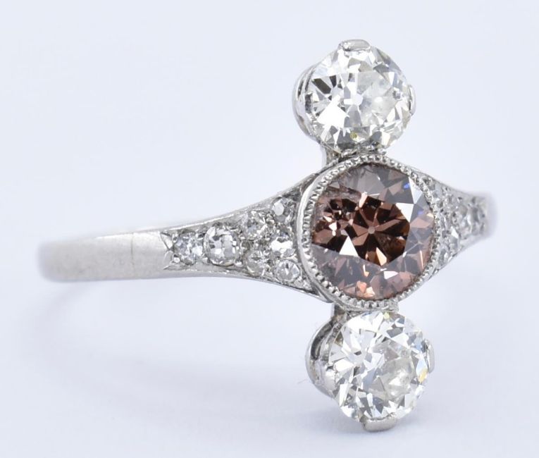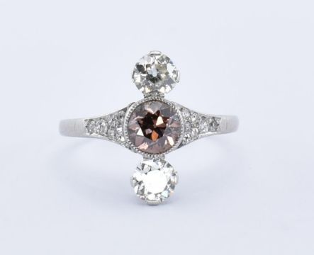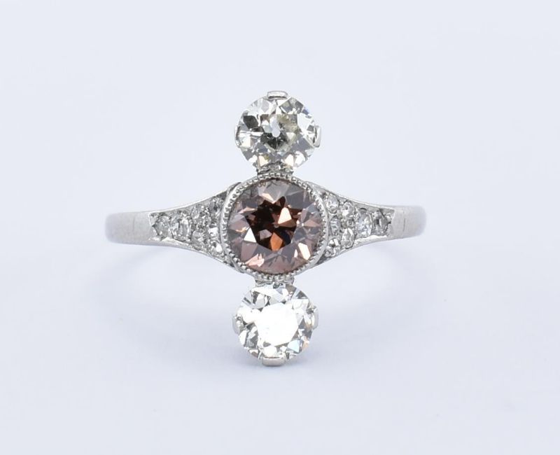 A platinum and diamond three stone ring. The ring set with a central old cut champagne diamond flanked by 2 round old cut diamonds having diamond set shoulders to plain tapering band. Total weight 3.4g / Size M.5