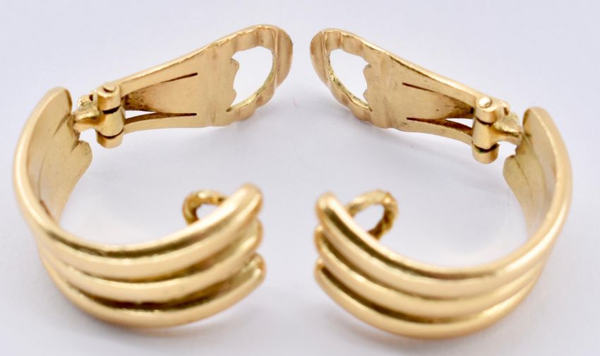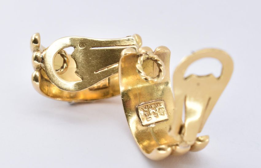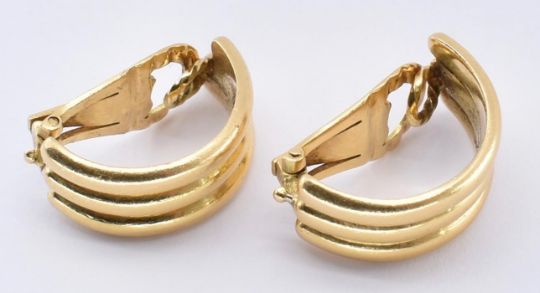 A pair of 18ct gold Zolotas clip hoop earrings. The earrings having ribbed hoops with clip fasteners. Signed Zolotas 750. French import marks. Weight 14.5g / measures 2cm drop