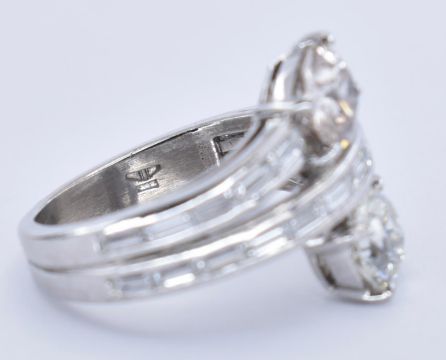 An Art Deco platinum and diamond 2 stone cross over ring. The ring set with 2 old cut diamonds having channel set baguette diamonds to jewel band. Principle diamond weights estimated at 0.70ct each. Estimated total diamond weight approx 2.0ct.  Set in presentation case marked Garrard & Co Ltd.  Total weight 6.5g / Size K