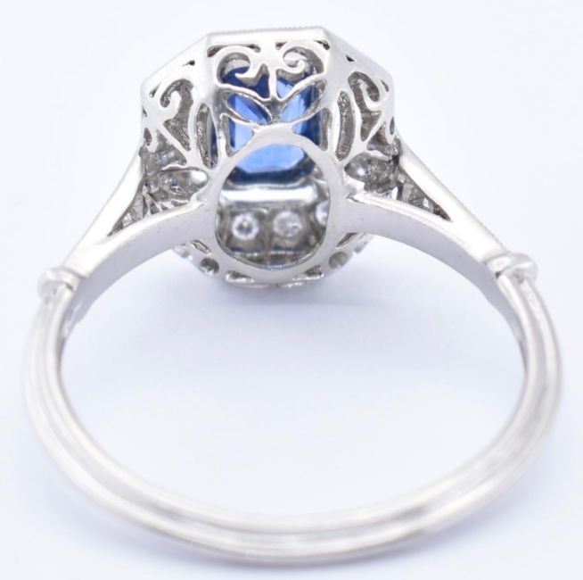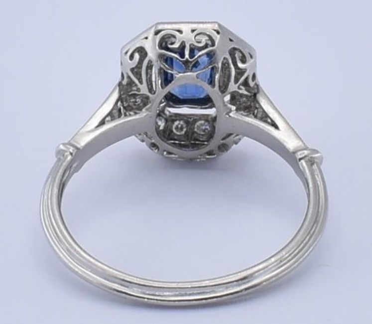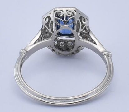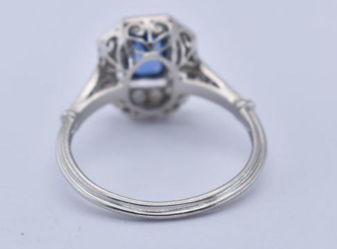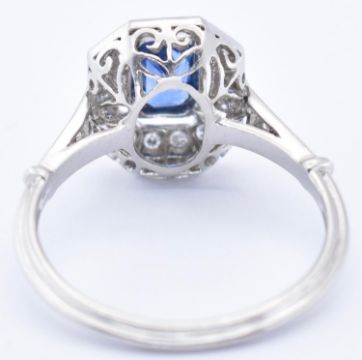 An 18ct sapphire and diamond cluster ring. The ring with a central octagon cut sapphire within a halo of diamonds in basket setting to pierced shoulders and ribbed tapering shank. Principle sapphire measures 6mm x 4mm approx.  Total weight 3.99g / Size N