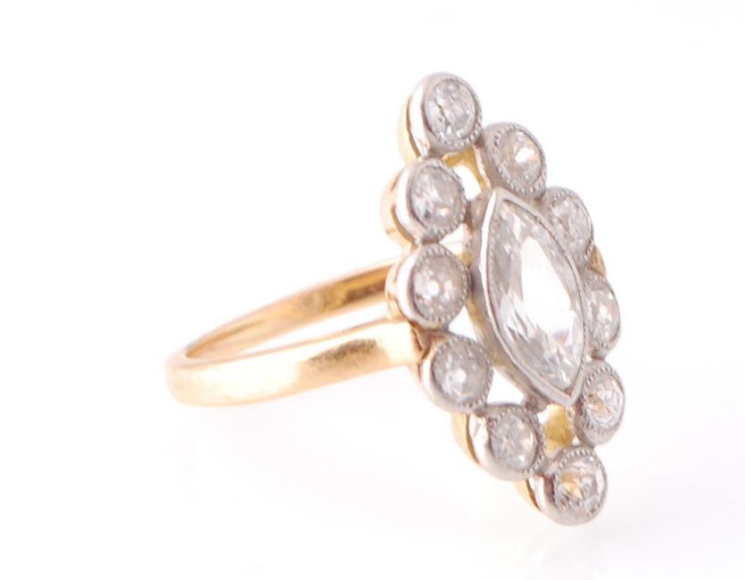 Antique Edwardian 18ct gold and diamond ring. The ring set with a central marquise cut diamond surrounded by an old cut Dimond halo of 10 diamonds. Assay punch mark to exterior of shank - tests indicate 18ct gold. Marquise diamond measures 8.5mm 4.5mm x 1.8mm. Estimated total diamond weight  0.9