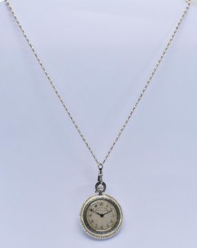 A French platinum pearl and diamond enamel set fob watch by Leo Weill & Frere. The watch with seed pearl surround and guilloche enamel, diamond and pearl back. The dial with breguet hands within enamel and gold bezel.  Set with a pearl mounted crown winder and bale to dog clasp and pearl chain link necklace. Total weight 22.3g / Chain length 50cm/ watch 3.2cm x 3.8cm
