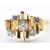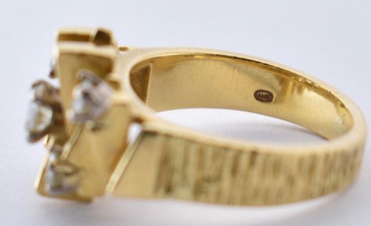 A 1970's hallmarked 18ct gold and diamond ring by Alan Martin Gard.  The ring having a bark effect shank, with a stepped geometric head, studded with 5 brilliant cut diamonds. Diamonds bright and lively. Estimated diamond weight 0.60cts. Hallmarked London, 1973, AMG. Total weight 8.1g. Size M.