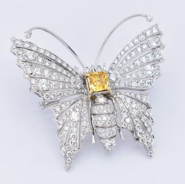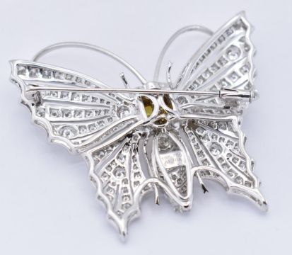 An 18ct gold and diamond butterfly brooch pin. The brooch set with a cushion cut fancy yellow diamond encrusted with round brilliant cut diamonds. Trombone clasp fastener to verso. Marked 18K / 750 AKRIA. Total weight 16.5g / Measures 4.8cm X 4.4cm