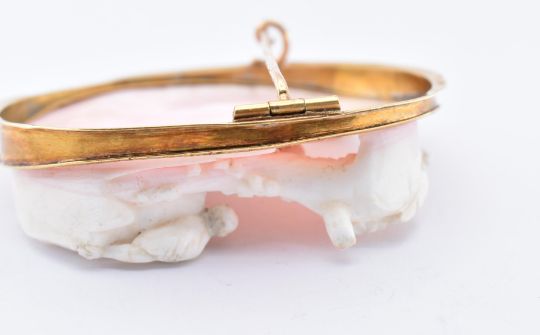 A 19th century French carved coral brooch pin. The pin having a large classical carved coral scene in relief, collet set within a gold mount having partial etch decoration to border. The brooch having  c clasp  fastener. French eagle and bigorne mark to mount and eagle to pin.  Measures approx 5.7cm x 4.5cm. Weight 27.7g.