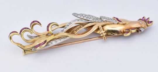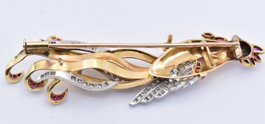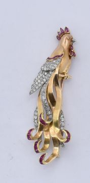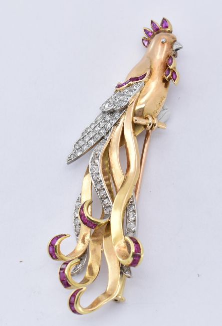 An 18ct gold ruby and diamond figural brooch. The brooch in the form of a bird of paradise set with single cut diamonds and calibre rubies. The trombone clasp verso. French eagle and dog mark to breast. Total weight 11.1g / measures 7cm