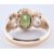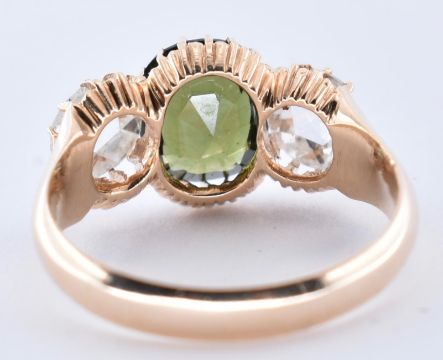 An 18ct tourmaline and diamond three stone ring. The ring set with a central oval mixed tourmaline flanked by 2 rose cut diamonds having pierced decorated shoulders to plain shank. Unmarked, tests indicate 18ct gold. Weight 4.5g. Size P