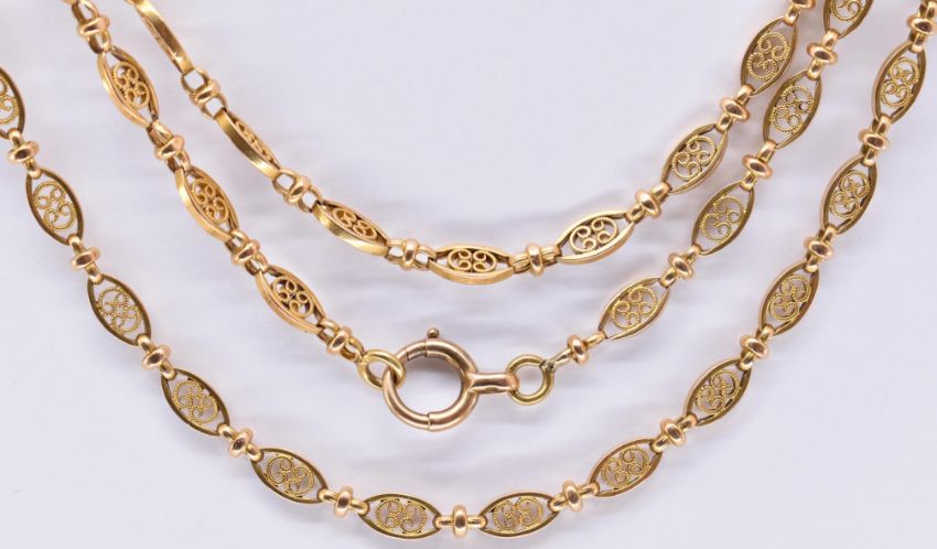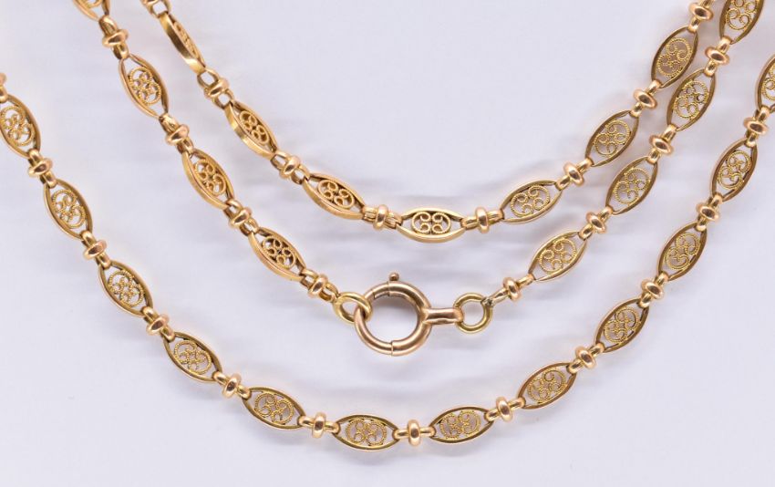 A French 18ct gold long guard chain necklace. The chain formed by  oval pierced filigree decorated links having round cross link spacers united by large spring hoop clasp. French assay mark to clasp. Weight approx 39.6g. Measures approx 138cms.  .