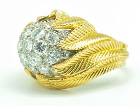 A cased French Van Cleef & Arpels 18ct gold platinum and diamond bombé ring. The ring set with a central dome of round brilliant cut diamonds ( Estimated diamond weight 2.5ct cts  estimated clarity colour VS - E-G).encased within a textured foliate mount to textured shank. In original case having company motif and dated 3 Juillet 1967. Marked VCA - SA OR 750 10092. French assay mark eagle and dog to outside of shank. Weight 10.58g. Size M