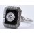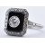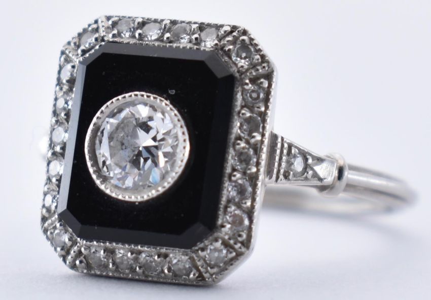 A platinum onyx and diamond panel ring. The ring set with a central round brilliant cut diamond within an octagon cut onyx plaque framed by round brilliant cut diamonds having a ribbed shank. Unmarked, tests as 18ct. Total weight 4.3g / Size L.5