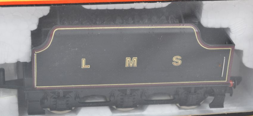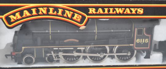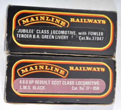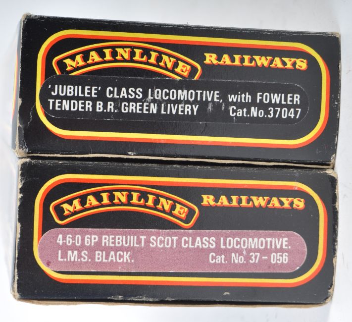 Two original vintage Palitoy Mainline made boxed 00 gauge model railway trainset locomotive engines comprising models No. 37047 Jubilee Class British Railways green livery ' Mars ' and 37-056 rebuilt Scot Class LMS black ' Scots Guardsman '. Both models appearing mint within original boxes.