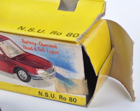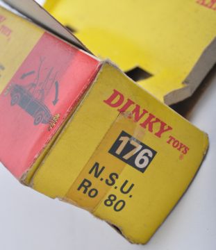 An original vintage boxed Dinky Toys diecast model car No. 176 N.S.U / NSU Ro 80 saloon with working head and tail lights. The metallic red body working appearing near mint and still retaining the original number plate decal. House in a good original box (missing one flap) with inner display stand.