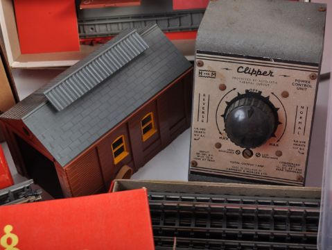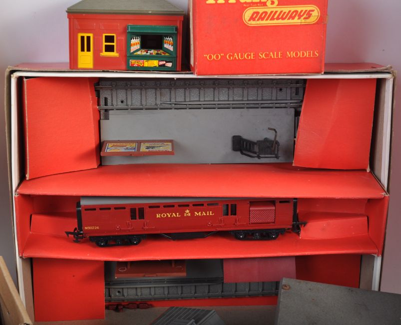A large collection of assorted Triang made 00 gauge model railway trainset track pieces and trackside accessories. The collection to include R.23 Operating Royal Mail Coach Set, R.81 Station Set, x2 R.76 Engine Shed, R.140 Signal Gantry, R.71 Foot Bridge, R.66 Porters Room, R.61 Signal Box and a large quantity of straight, right and left point curved track. All within original boxes.