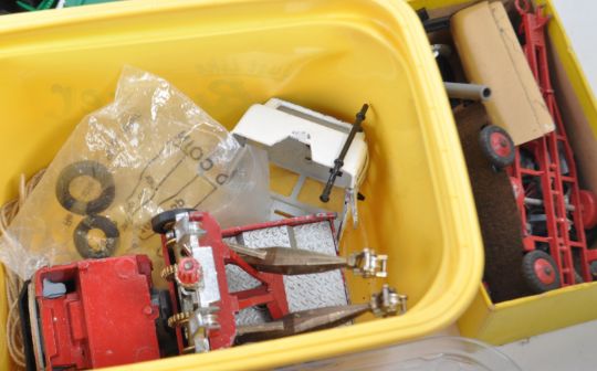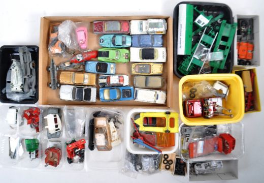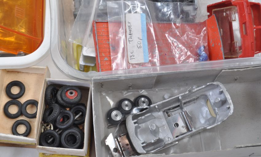 A large collection of assorted vintage Dinky Toys and Corgi Toys cars, parts and accessories. Cars to include Corgi Chevrolet Impala, Aston Martin DB4, Ford Consul, some Whizwheels examples, Dinky Toys Hillman Husky and others. Parts to include a large quantity of wheels, chassis, cabs, trailers and more. An interesting assortment suitable for code 3.