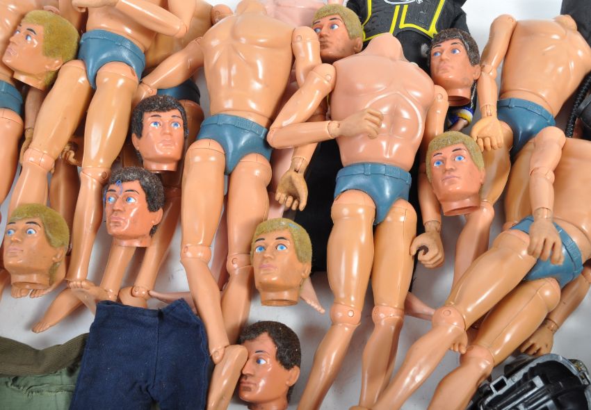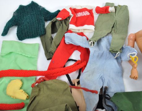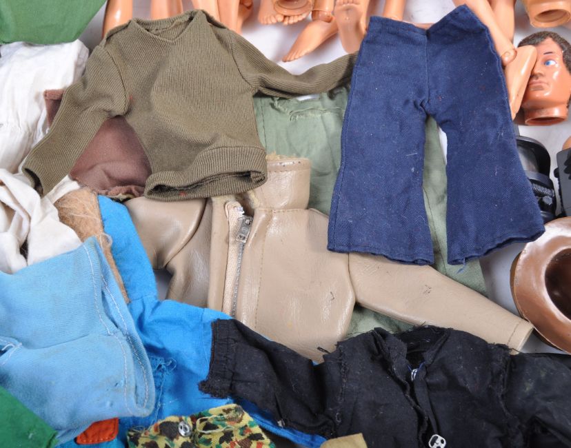 A large collection of original vintage Palitoy made Action man uniforms, accessories and figures. The collection to include uniform items comprising Space Ranger, Footballer, German Paratrooper, Marine, Soldiers, Helicopter Pilot and many more, a large quantity of helmets, boots, guns and weapons, x8 loose heads with flock hair and eagle eyes and x11 bodies. A great assortment.