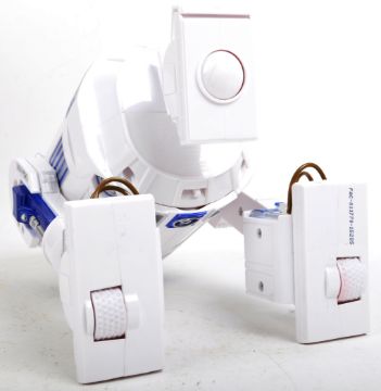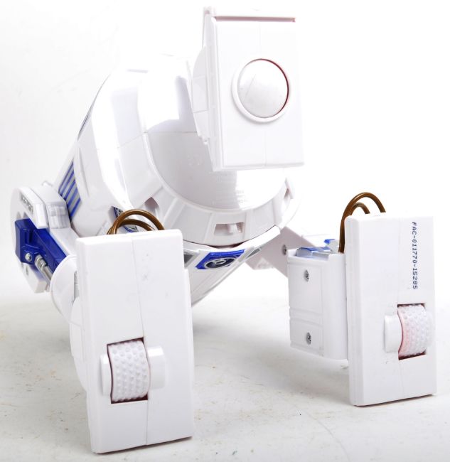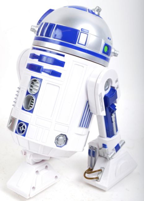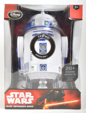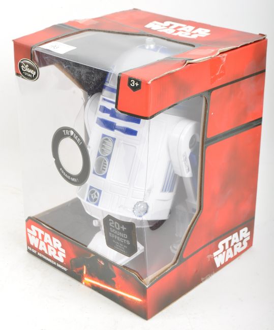A Disney Store made Star Wars R2-D2 interactive Droid boxed toy action figure. The battery operated figure having sound-activated and button-activated modes with light up features and sound effects. Head turns and body spins. Tested in full working order. Figure measures approx 26x17cm. Great toy.