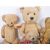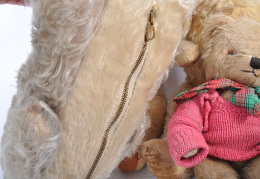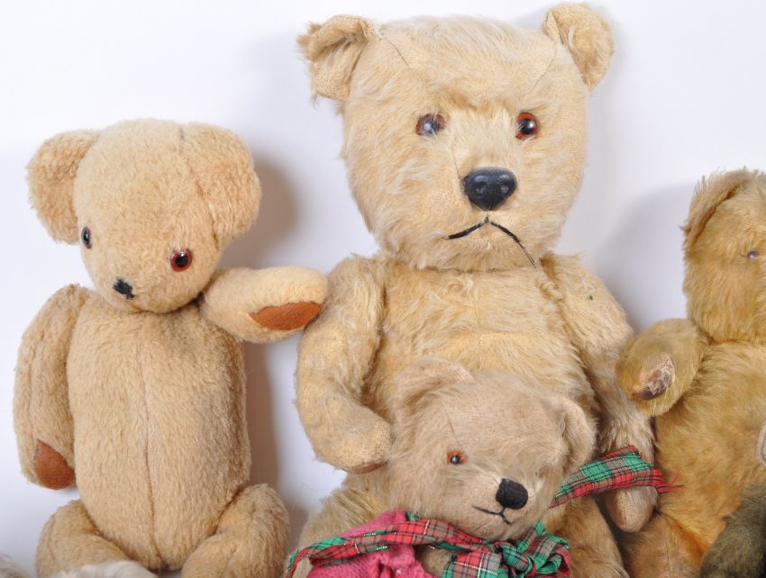 A collection of x7 antique / vintage British soft toy teddy bears, possibly Chiltern / Chad Valley comprising x4 bears of golden mohair and plush examples with bead eyes, stitched / rubber noses and fully jointed limbs along with a rabbit, monkey and dog. Good collection