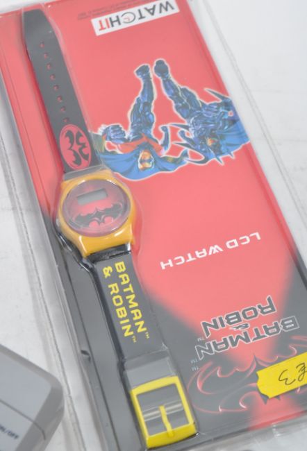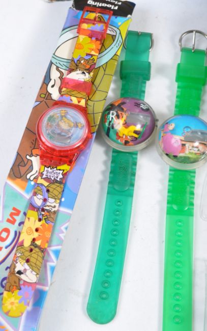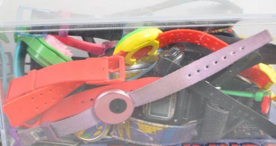 A collection of assorted vintage table top electronic computer games / video games and watches. The collection to include a boxed Tomy made Kongman dexterity game, Grandstand Scramble, x2 Systema Space Invaders hand held games and a large quantity of TV and film related watches comprising The Flintstones, Batman and Robin, The Rugrats, Gladiators and other retro style examples.
