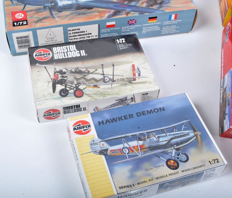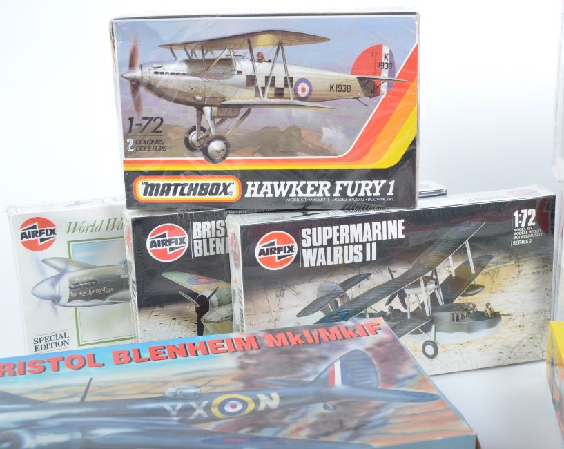 A large collection of x18 assorted plastic model kits of military and aviation interest by makers Airfix, Matchbox, Revell, Heller and other. Models to include Hawker Demon, Bristol Bulldog II, Bristol Blenheim MKI, Airfield Control Tower, WWII RAF Pilots and Ground Crew and others. 12 boxes are still factory sealed with cellophane while others remain unchecked. Interesting assortment.
