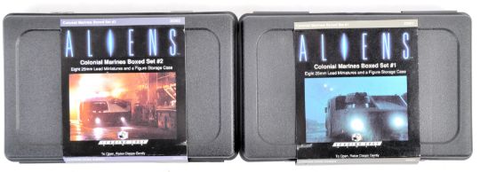 Two vintage Leading Edge Games made Aliens lead figure table top fantasy war game box sets from the Colonial Marines range comprising models No. 20301 Box Set #1 and 20302 Box Set #2. Each box containing x8 lead miniatures of characters Ripley, Drake, Frost, Spunkmeyer, Burke and others. Housed in black storage case. Figures measure approx 3cm.