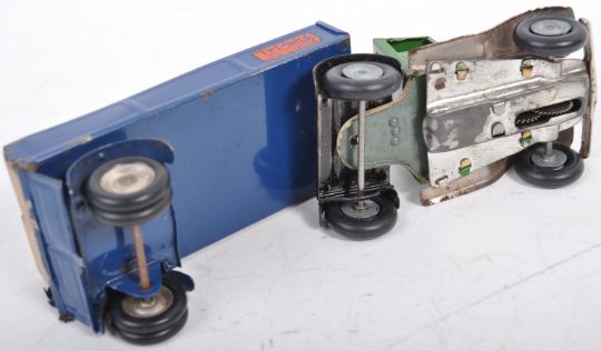 An original vintage Triang / Tri-ang Minic Toys made tinplate clockwork with load. A green a white metal cab with blue trailer carrying wooden boxes stamped with Minic, London and Calcutta. Triang decals to the side. No key, but working order. A charming vintage toy.