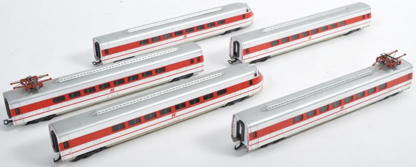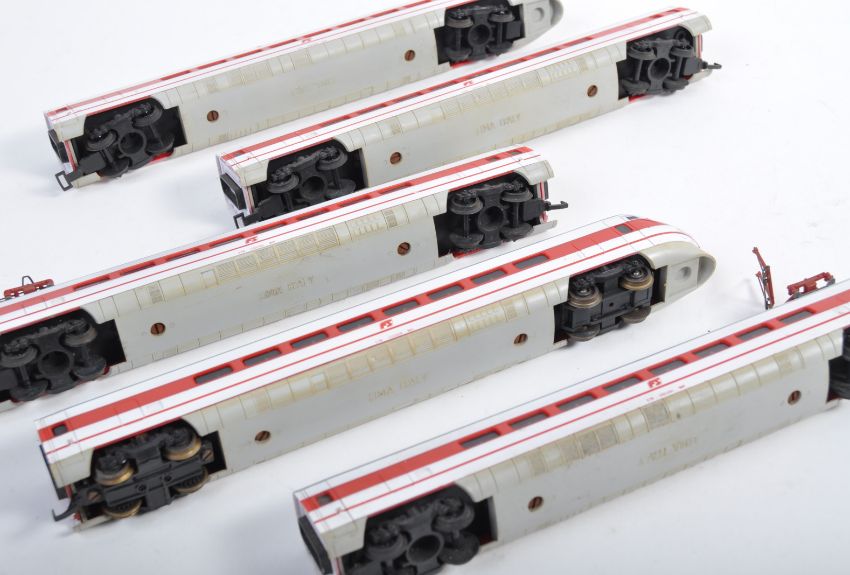 A collection of x5 unboxed Lima made HO / 00 gauge model railway trainset locomotive electric engine and carriages comprising Pendolino ETR 40 loco and a rake of x4 carriages. Good examples.