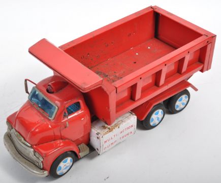 An original 1960's vintage ' Yonezawa ' made Japanese tinplate battery operated mechanical Chevrolet Dump Truck. Red bodywork with black rubber wheels and tinplate Chevrolet branded hubcaps. The battery operated truck having lifting / tipping action a working front red light. Great example.
