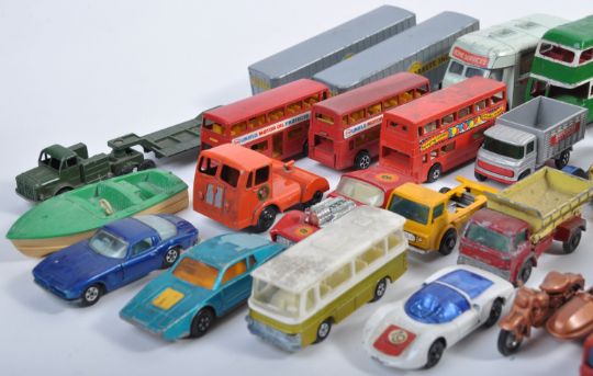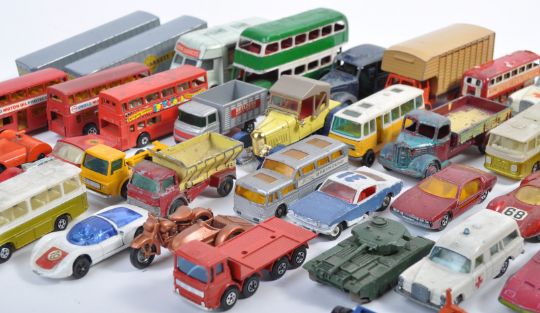 A large collection of assorted original vintage diecast model cars of various scales and makers to include Dinky Toys, Corgi Toys, Corgi Juniors, Corgi Whizzwheels, Matchbox Superfast, Matchbox Lesney and others. Examples of Corgi Smiths Karrier Shop, Dinky Toys Austin Pickup, Matchbox Mercedes Benz Ambulance, Matchbox Mercedes Coach and many more. Interesting assortment.