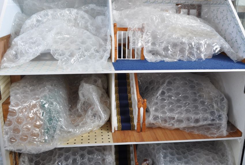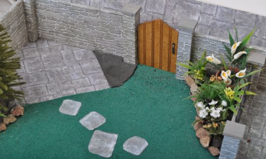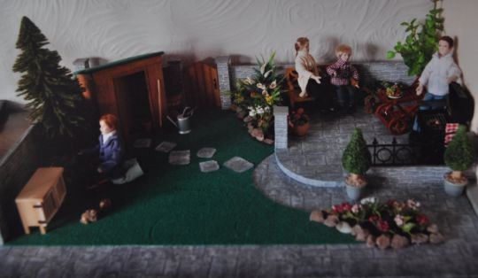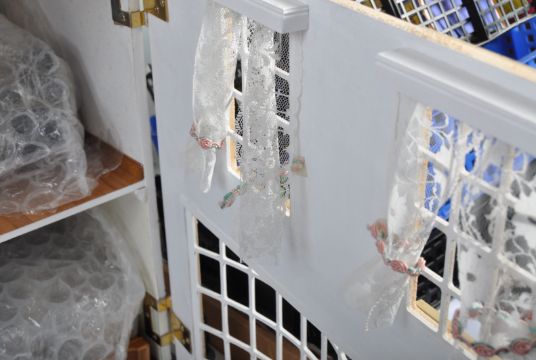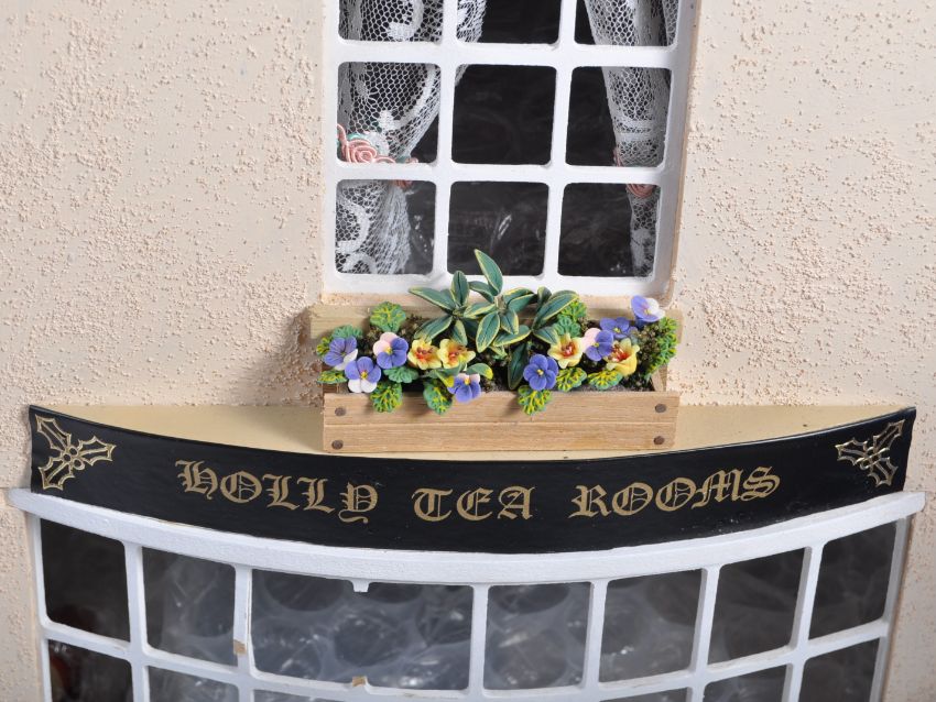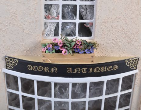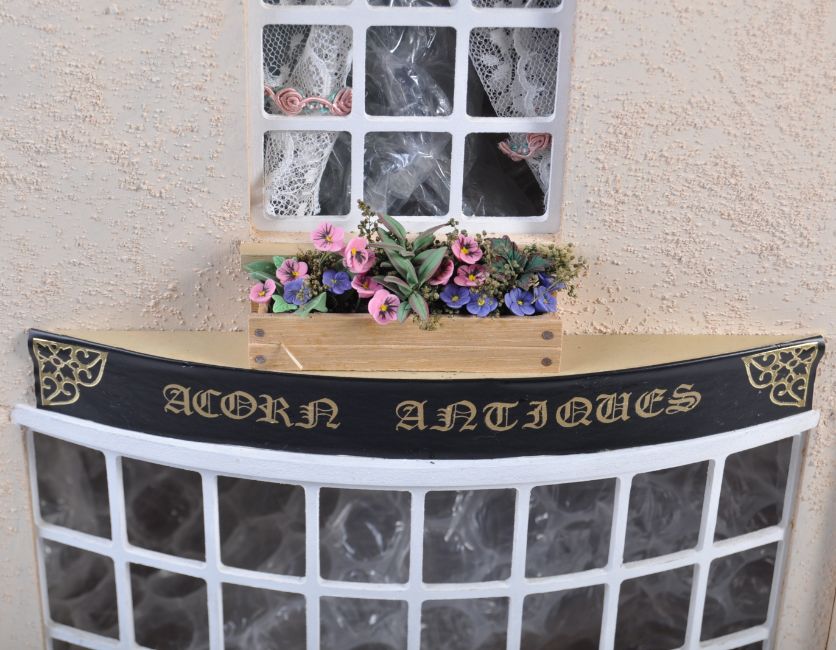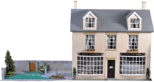 Dolls House - a large 20th century Victorian style three storey doll's house ' Acorn Antiques ' and ' Holly Tea Rooms '. Divided into six rooms across three storeys with the relevant shops to the bottom tier and living quarters above. Hinged opening front in two sections, and a lift-up hinged attic. Fully furnished with all miniature accessories and figures. To one side sits a miniature scale garden, fully decorated with faux plants and trees etc. Wired for lighting. Very well made and an impressive display. Measures approx: H68cm x W70cm x D38cm (excluding garden).NB: photographs of the dolls house set up have been provided by the vendor before the contents being securely packed away for transportation. Whilst every effort was made to pack the contents safely, East Bristol Auctions cannot guarantee condition, completeness nor accuracy of furnishings as they remain wrapped.