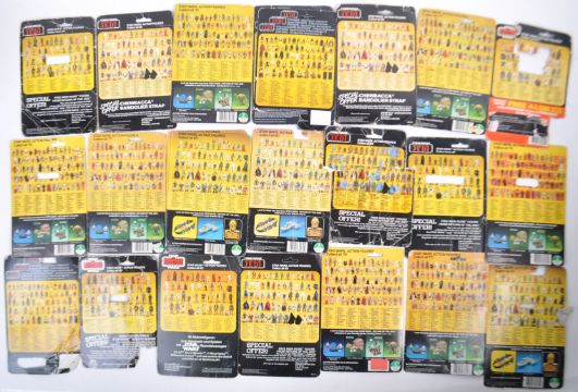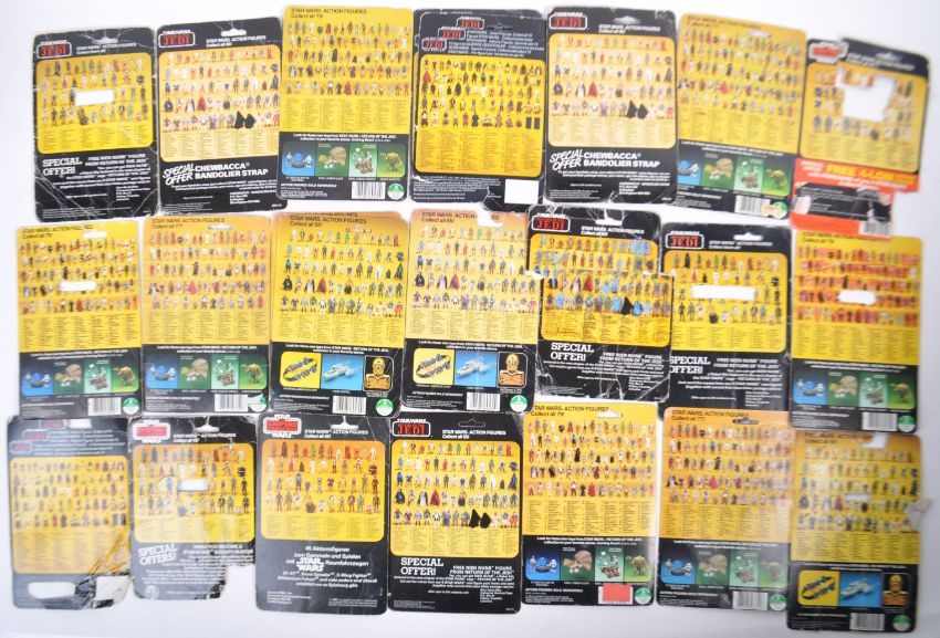 Star Wars - a collection of x22 original Palitoy / Kenner made Star Wars action figure card backs (no figures). Various cards featured, including; 8D8, Yoda, Logray, Star Destroyer Commander, R5-D4, Ben Obi Wan Kenobi, Luke Skywalker, FX-7, and others. Mostly Return Of The Jedi but some Empire Strikes Back included. Various conditions.