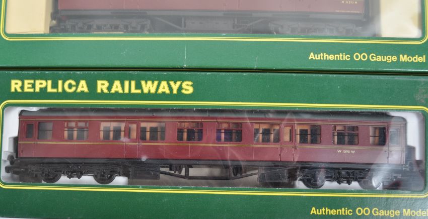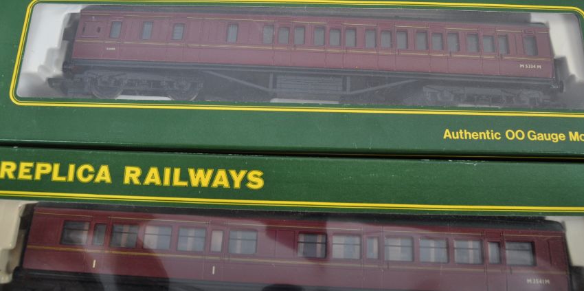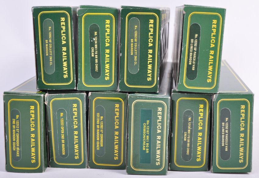 A collection of x10 Replica Railways 00 gauge model railway trainset locomotive rolling stock coaches and carriages comprising No. 12252 Parcels Van, 12167 MK1 BG, 12202 57' corridor and others. All models appearing mint within original boxes.