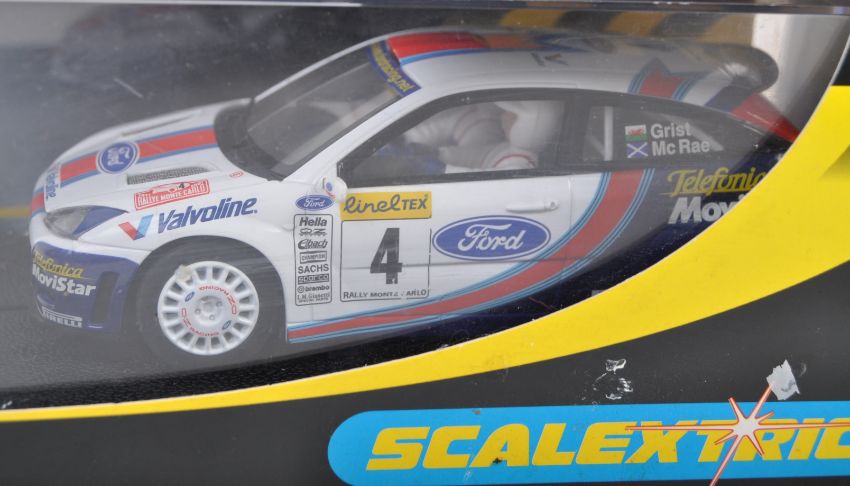 A collection of x3 original Hornby Hobbies and SCX made Scalextric boxed slot racing cars comprising Hornby Hobbies C2449 Porsche GTI Collectors Club 2002, C2342 Ford Focus WRC and SCX made 60680 Peugeot 206 WRC. All models appearing mint, within original boxes.