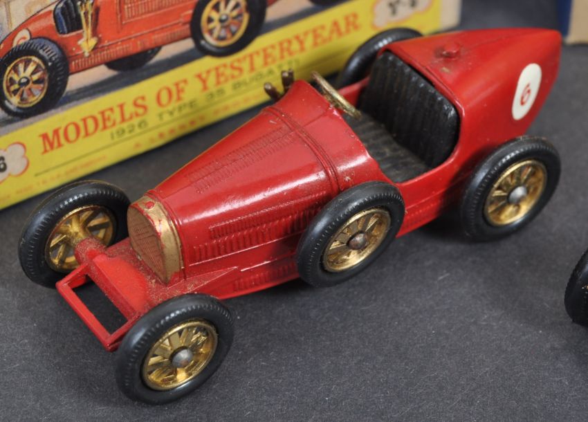 Matchbox Models Of Yesteryear - a collection of x4 variations of ' Y6 ' / ' Y-6 ' Bugatti Type 35. Featuring the following variations;- rare gold radiator variation No.6 in red - Blue, No.6 with black interior and gold radiator.- No.6 Red with red radiator, white dashboard- Blue No.6 with gold radiator, red interiorAll models appearing very near mint to mint, in very near mint to mint boxes. Great variation collection.