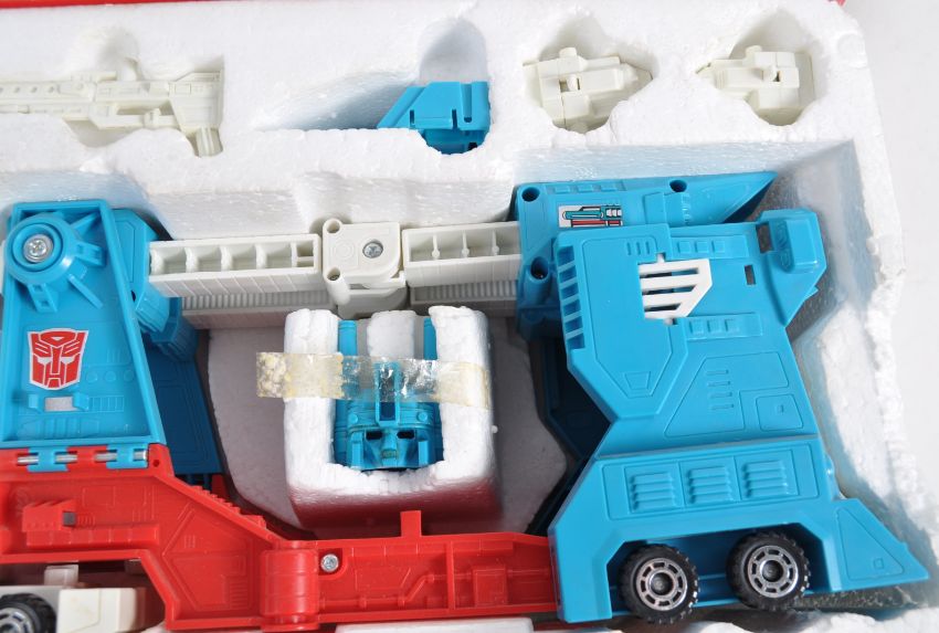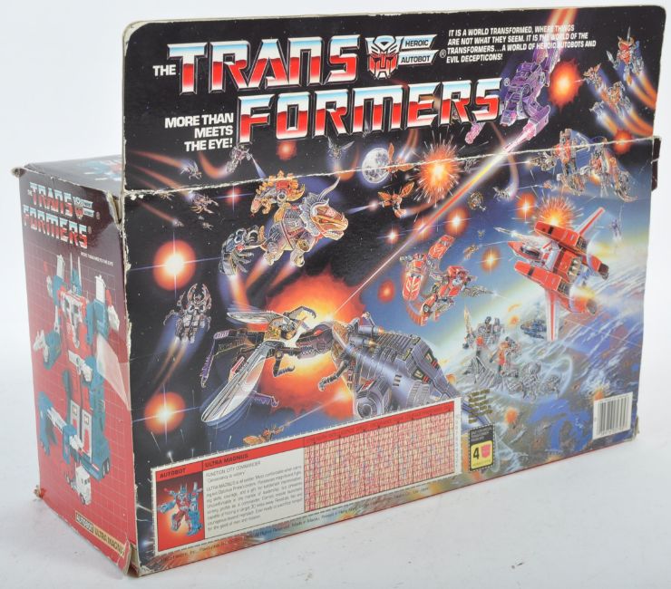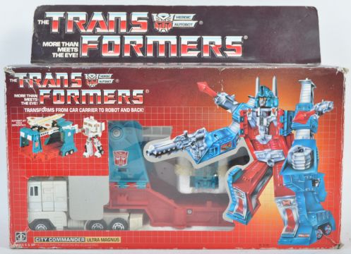 An original vintage 1980s (1985) Hasbro made G1 Transformers / The Trans Formers boxed action figure City Commander Ultra Magnus. Transforms from car carrier to robot. Unchecked for completeness and housed within original box.