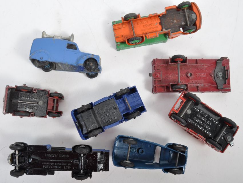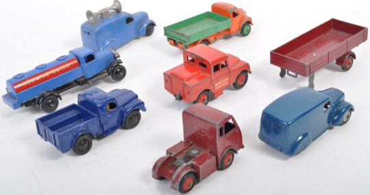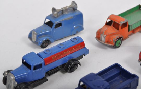 A collection of x7 assorted vintage Dinky Toys diecast model cars and other vehicles comprising 255 Mersey Tunnel Police truck, Dodge Tipper Truck, Army 1 Ton Cargo Truck, Hindle Smart Helecs trailer, Speaker van and Redline-Glico truck (unsure of originality). Good collection of vintage Dinky Toys.