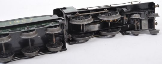 An original vintage circa 1930's Bassett-Lowke / Bassett Lowke 0 gauge tinplate clockwork model railway trainset locomotive engine ' Duke Of York ' and 1927 tender. No key, but mechanism working. A charming vintage loco.