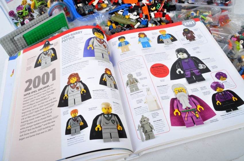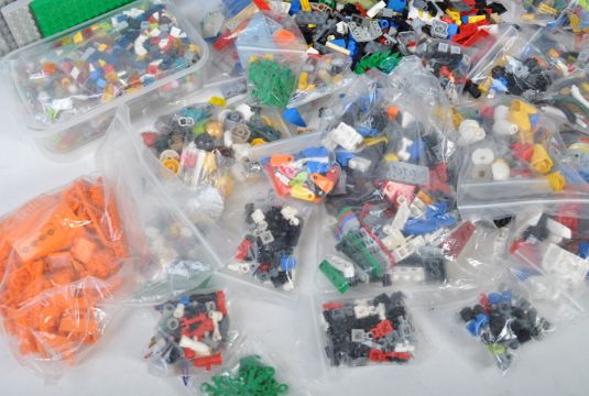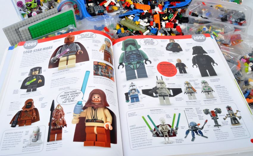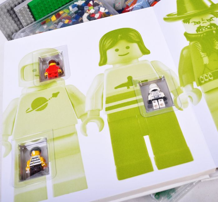 A large collection of assorted Lego books, brick parts and accessory pieces comprising x3 Lego Minifigure encyclopaedia, x1 vintage (1974)  Lego set 200c ' Lego Family ' and a large quantity of small bricks to include tiles, plates, studs, minifigure weapons / accessories, trees, base plates and more. Good assorted collection.