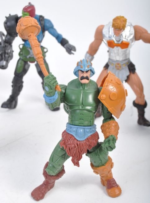 A collection of x9 assorted circa 2001 Mattel made MOTU Masters Of The Universe playset action figures comprising He-Man, Skelator, Ram Man, Beast Man, Man At Arms, Trap Jaw and Mer-Man. Some figures having voice features. Good assortment.
