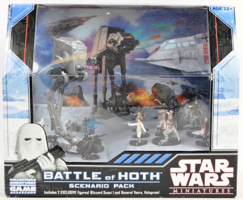 An original Wizards Of The Coast made Star Wars Miniatures Battle of Hoth scene pack. The set containing x17 miniatures, double sided fold out battle map of Hoth, stat cards and rule booklet. All contents appearing mint within original box. Great set.