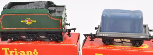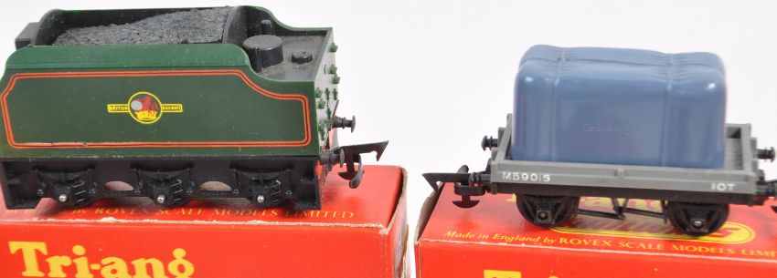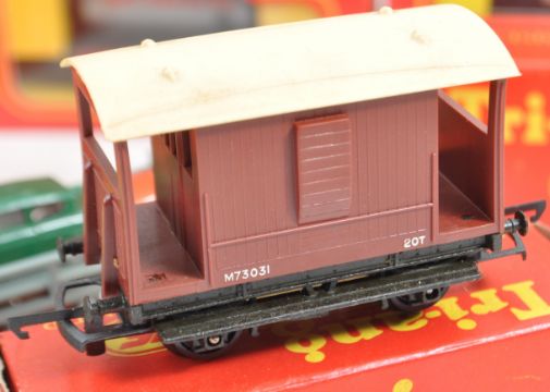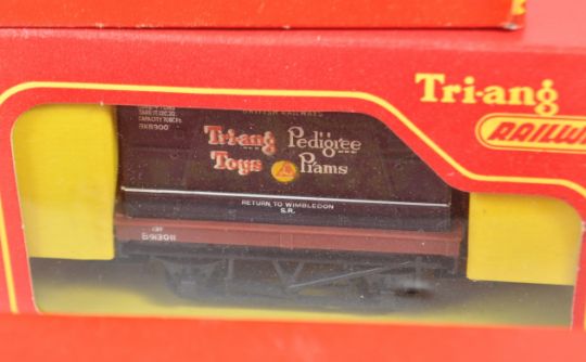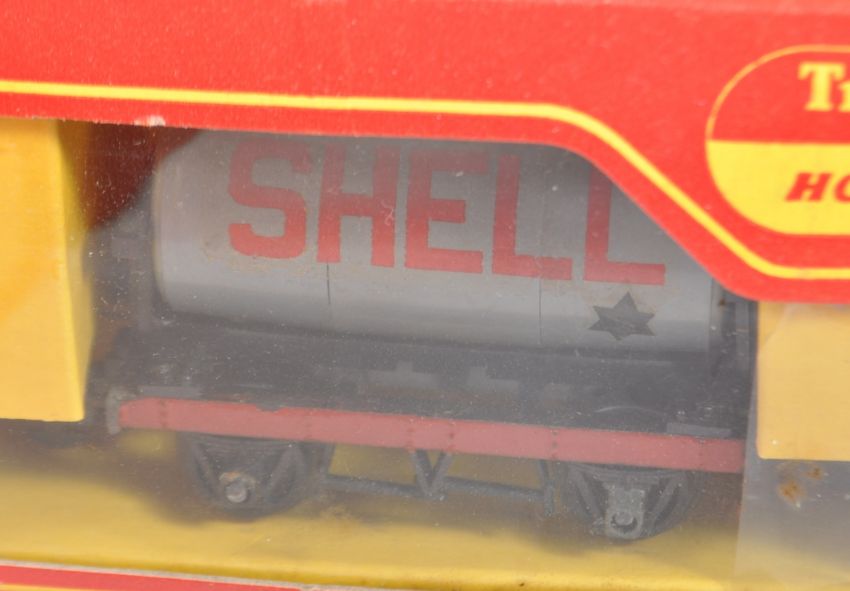 A large collection of x23 vintage boxed Triang made 00 gauge model railway trainset locomotive rolling stock / wagons comprising R210 Tank Wagon Shell Fuel, R561 Container Wagon, R124 Brake Van, R15 Milk Wagon, R14 Fish Van, R13 Coal Truck, R17 Bolster Wagon, R123 Horse Box and many others. Contents appearing near mint, all within original boxes. Great collection